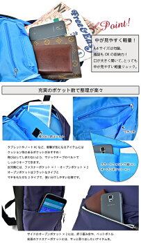 その他商品説明 軽さと機能性を重要視したスクエア型のリュック 充実したポケットと、撥水性のある表地がポイントです。